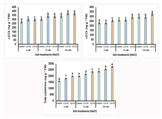 Seed soaking in 50 µM c-Z-Ck or 40 µM t-Z-Ck affected the contents of Na+, Cl−, and K+ and the ratio of K+/Na+ of maize (Giza-168) plants exposed to salinity stress.