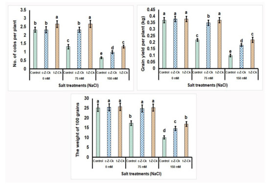 Seed pretreatment using 50 µM c-Z-Ck or 40 µM t-Z-Ck did not affect the number of cobs and grain yield per plant, as well as the weight of 100 grains of maize (Giza-168), with minor fluctuation (Figure 4). Exposing maize plants to salt stress with 75 mM NaCl decreased the number of cobs and grain yield per maize plant by 42.9% and 40.5%, respectively, as well as the weight of 100 grains by 31.0% compared to the control. Further, exposing maize plants to salt stress with 150 mM NaCl further decreased number of cobs and grain yield per plant by 71.2% and 73.0%, respectively, as well as the weight of 100 grains by 59.9% compared to the control. However, pretreatment with c-Z-Ck and t-Z-Ck mitigated the 75 and 150 mM NaCl stress impacts and significantly elevated plant growth and yield components compared to the stressed 75 and 150 mM NaCl control. Seed treatment with t-Z-Ck outperformed c-Z-Ck under both stress concentrations (75 and 150 mM NaCl), which exceeded the stressed control by 12.7% and 24.81% for the number of cobs per plant−1, 5.41% and 18.18% for grain yield per plant−1, and 2.0% and 13.02% for the 100 grain weight, respectively, under the stress conditions of 75 and 150 mM NaCl (Figure 4).