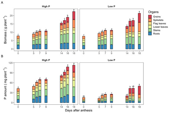 Biomass (A) and P amount (B) in different organs of durum wheat grown under high and low P supplies. Values are mean ± standard errors of three replicates. Different letters indicate significant differences between days for total biomass or P amount according to the LSD test at p < 0.05.