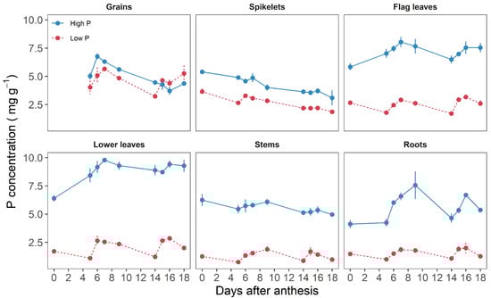 Phosphorus concentrations in durum wheat organs (Grains, spikelets, flag leaves, lower leaves, stems, and roots) during grain development (between anthesis and 18 days after anthesis). Plants were grown in a hydroponic culture with high or low P supply. Symbols are means of three replicates. Bars are standard errors.