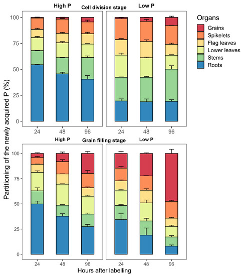 The partitioning of the newly acquired P in different durum wheat organs (grains, spikelets, flag leaves, lower leaves, stems, and roots) following P labeling at the cell division stage and grain filling stage. Values are the mean ± standard error of three replicates. Plants were grown in a hydroponic culture with high or low P supply. Each labeling experiment lasted 24 h.