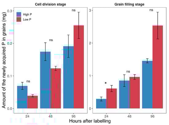 The amount of newly acquired P allocated to grains after the two labeling experiments in high and low P durum wheat plants; 24 h, 48 h, and 96 h represent hours after P labeling. Values are the mean ± standard error of three replicates. The asterisk indicates statistical significance between P supply (p < 0.05). ns: not significant. Note that the y-scale in the figure is different between the two stages for better visualization.
