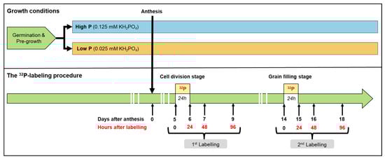 The labeling experiments with P (half-life 14.3 days) were performed at two key stages of grain development: the first at 5 DAA (cell division phase) and the second at 14 DAA (grain filling) [16] (Figure 5). On the day of the first labeling, stock nutrient solution (54 L for each treatment) with the same composition as previously described was prepared and spiked at approximately 6 and 13 MBq of P radioactivity of orthophosphate ions (NEX054010MC, PerkinElmer SAS, France) for low and high P supplies, respectively. Thereafter, 18 plants (9 per treatment) were transferred to an adjacent greenhouse dedicated to handling radioisotopes using the same conditions specified above. Labeling experiments were initiated 8 h after the start of the photoperiod. The plants remained in the labeling solution for 24 h. Immediately after the end of the labeling period, 6 labeled plants (3 per treatment) were harvested and separated as detailed above. The remaining 12 plants were placed in a fresh unlabeled nutrient solution to continue their development under the same conditions until harvest. Before transferring plants to the unlabeled solution, roots were bathed and carefully rinsed three times with deionized water to eliminate the adhered P from root surface. The 12 remaining plants were harvested at 48 h and 96 h after labeling (i.e., 6 and 9 days after anthesis). The second P labeling at the grain filling stage, starting from 14 DAA, was carried out following the same procedure as the first one (Figure 5).