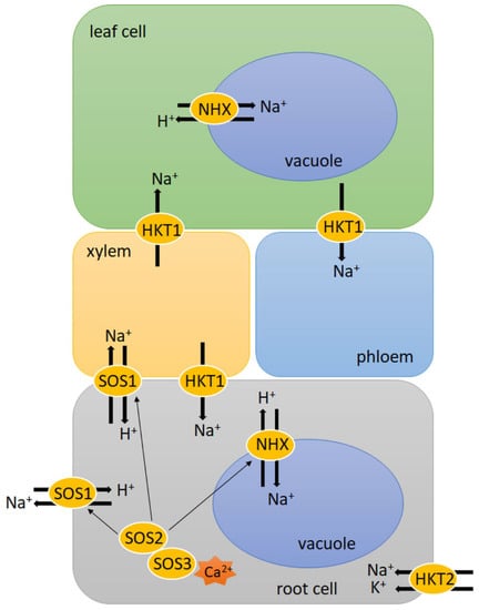 Na+ transportation under salinity. Plants remove Na+ from the cytoplasm using plasma membrane Na+/H+ antiporter (SOS1), which is activated through phosphorylation, catalysed by the SOS2–SOS3 kinase complex, SOS3 is a Ca2+ sensor. Compartmentation of Na+ into vacuoles occurs by Na+/H+ antiporter (NHX), which is also activated by SOS2–SOS3 kinase complex. High-affinity K+ transport (HKT) proteins, are Na+ transporters (class 1) or Na+/K+ symporters (class 2). HKT1 proteins remove Na+ from xylem. HKT2 play role in Na+ uptake in the root. Details are described in Salinity paragraph.