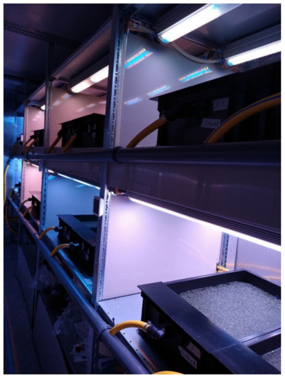 Experiments were carried out in a container (length × width × height: 5 × 3 × 3 m) at the campus of the University of Applied Sciences Osnabrück, Germany. Trials were conducted in a re-circulating, aquatic IVF (Figure 1 and Figure 2).