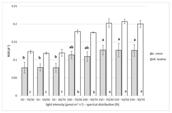Relative growth rate (RGR; d−1), based on dry weight, for Lemna minor (gray shaded columns) and Wolffiella hyalina (white columns). Plants were cultivated for seven days with different light intensities (50, 100 and 150 µmol m−2 s−1) and spectral distributions (red/blue: 70/30, 50/50 and 30/70%). For the abbreviations used, see Table 1. Number of parallel samples n = 4. Different letters indicate significances within a species, based on one-way ANOVA test, Tukey p ≤ 0.05. Error bars indicate standard deviations.