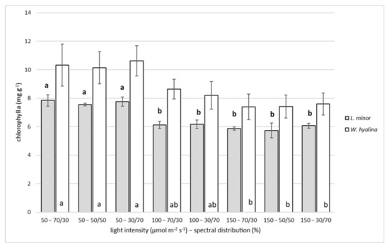 A significant decline between the treatments of the lowest light intensity (50 µmol m−2 s−1) and the two higher treatments (100 and 150 µmol m−2 s−1) can be observed for L. minor. For W. hyalina, the 150 µmol m−2 s−1 treatments were significantly lower compared to the 50 µmol m−2 s−1 treatments. Different light spectra had no significant impact on the chlorophyll a content of both species.