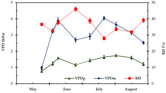 Seasonal predawn (VPDp) and midday (VPDm) vapour pressure deficit and relative humidity (RH) in the study site, during the experimental period, from 27 May to 28 August. The values are means ± SE (n = 24).