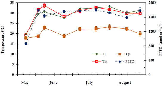 Seasonal Photosynthetic Photon Flux Density (PPFD), leaf temperature (Tl), morning (Tp) and midday (Tm) ambient air temperature during the experimental period from 27 May to 28 August. The values are means ± SE (nTp,Tm = 24, nTl = 48).