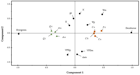 Principal component analysis (PCA) loading plot representing the variables and the species characterizing the two components. Black dots indicated predawn (Ψp) and midday (Ψm) leaf water potential, midday transpiration rate (E), midday stomatal conductance (gs), midday leaf hydraulic conductance (KLeaf) and midday vapour pressure deficit (VPDm); brown squares indicated the deciduous species: Coronilla emeroides (C.e.), Carpinus betulus (C.b.), Pistasia terebinthus (C.t.). Cercis siliquastrum (C.s.), while green triangles indicated the evergreen species: Arbutus unedo (A.u.), Arbutus adrachnae (A.a.), Quercus coccifera (Q.c.) and Quercus ilex (Q.i.).