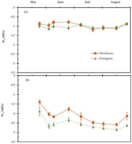 Seasonal (a) predawn (Ψp) and (b) midday (Ψm) leaf water potential of deciduous and evergreen shrubs during the experimental period from 27 May to 28 August. The values are means ± SE (n = 24).