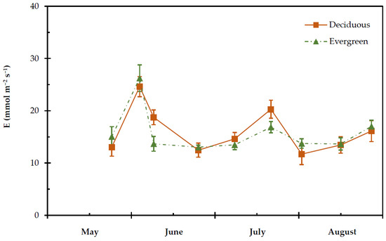 Seasonal transpiration rate (Ε) of deciduous and evergreen shrubs during the experimental period, from 27 May to 28 August. The values are means ± SE (n = 24).