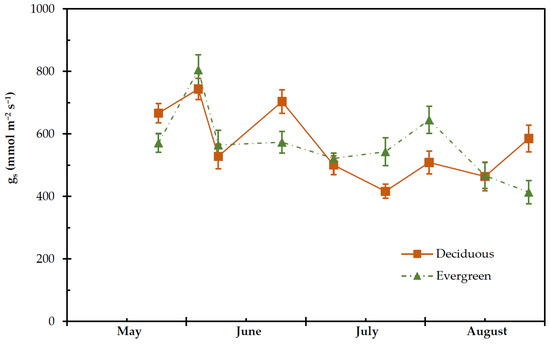 Seasonal stomatal conductance (gs) of deciduous and evergreen shrubs during the experimental period, from 27 May to 28 August. The values are means ± SE (n = 24).