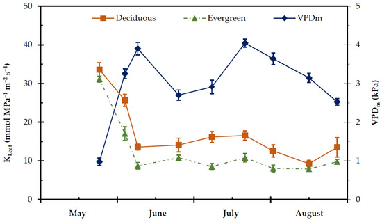 Seasonal midday vapour pressure deficit (VPDm) and leaf hydraulic conductance (KLeaf) of the considered deciduous and evergreen shrubs during the experimental period, from 27 May to 28 August. Values are means ± SE (nKleaf = 24, nVPDm = 48).