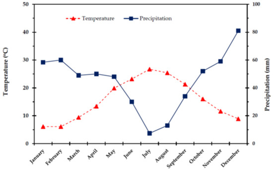 The study was conducted on Olympus Mountain (40°06′54″ N, 22°28′42″ E), which is a great, long-lived natural laboratory [96,97,98] in 2009, at an altitude of 554 m a.s.l., in an area located 5 Km from the town of Litochoro, 95 km south-east of Thessaloniki, in Greece. The climate of the study area is characterized as Cfa in the Köppen-Geiger system (http://www.en.climate-data.org, 7 January 2022) and as Mediterranean with cold and wet winters, dry and warm summer according to the bioclimatogram of Emberger. The mean annual rainfall in the study area ranges from 800 to 1000 mm, while substantially elevated precipitation is recorded during winter. The minimum air temperature ranges from 13 to 6 °C (during summer and winter, respectively). The maximum air temperature ranges from 4.9 to 6.7 °C during winter, and from 20 to 26 °C during summer. The warmest month is July and the coldest is December. The mean annual relative humidity (RH) ranges from 75 to 80%. Average RH values during the most humid month (December) is 85–90% and during the driest month (July) 30–50%. The monthly changes of temperature and precipitation (ombrothermic diagram) during the year of the measurements, from the nearest meteorological station of Dion (40°12′00″ N, 22°30′00″ E), are presented in Figure 9.