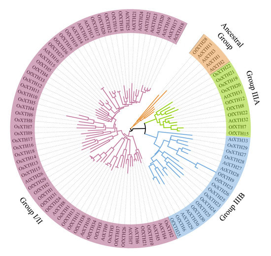 Phylogenetic analysis of XTH proteins from O. fragrans, A. thaliana, and O. sativa. Each subgroup is distinguished by a different color.