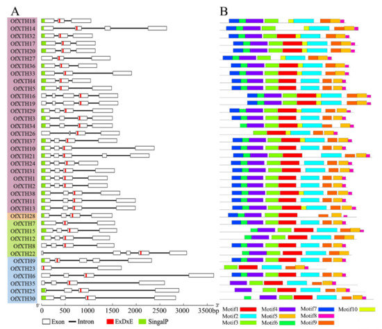 Gene structure and motif distribution of OfXTH proteins. (A) Gene structure, putative signal peptide sequences, and conservative motif sequence. Each subgroup is distinguished by a different color. White boxes and black lines represent exons and introns, respectively. The green and red strips indicate putative signal peptide sequences and conservative motif sequence, respectively. (B) The motif distribution. Motifs 1–10 in the OfXTH proteins are represented by different colored boxes.