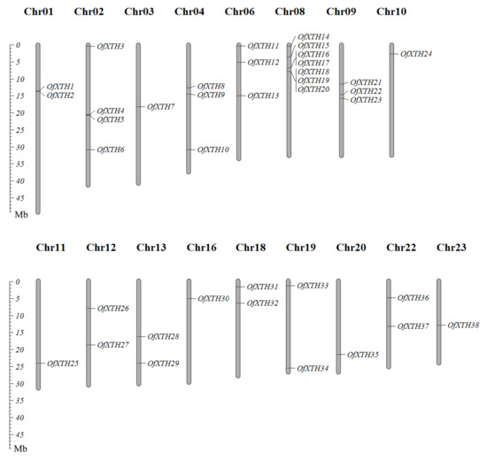 The upstream sequences (2 kb) of the OfXTH-coding sequences were obtained from the genome database of O. fragrans [35]. PlantCARE (http://bioinformatics.psb.ugent.be/webtools/plantcare/html/ (accessed on 17 March 2022)) was used to identify cis-acting regulatory elements in OfXTH genes promoter.