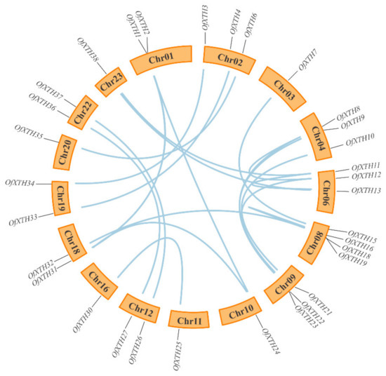Synteny analysis of 38 OfXTH genes in O. fragrans. Orange rectangles represent chromosomes of O. fragrans, and blue lines represent segment duplicate gene pairs.