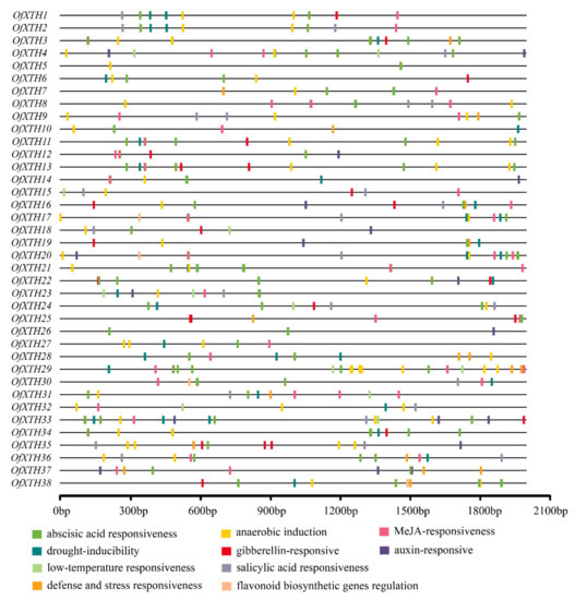 Prediction of cis-responsive elements in the OfXTH promoters. Different cis-responsive elements are represented by different colored boxes.