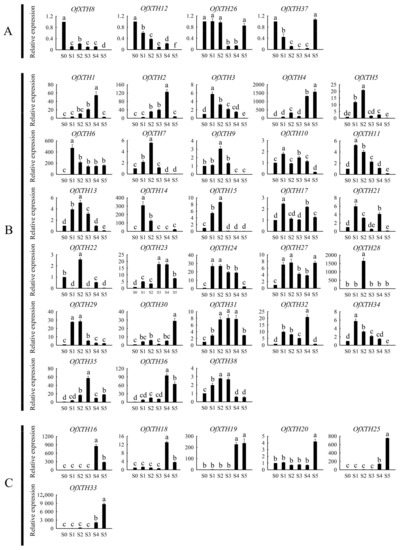Expression profiles of OfXTHs at different flowering stages. Significant differences are identified by SPSS (version 22) with Duncan’s test (p < 0.05) and are represented by different letters above the error bars. (A) OfXTH genes highly expressed in the S0 period. (B) OfXTH genes upregulated in the S1 and S2 period. (C) OfXTH genes upregulated in the S4 and S5 period.