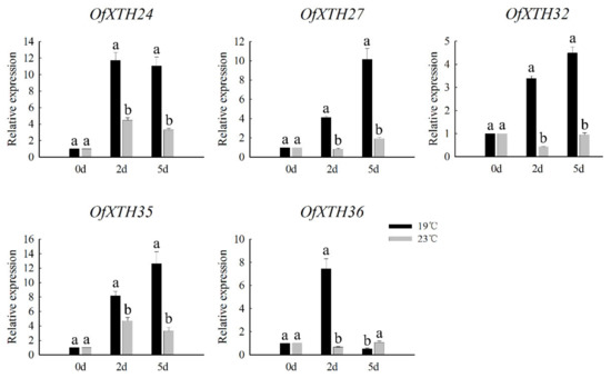 The qRT-PCR analysis of five differentially expressed OfXTH genes treated at 19 °C and 23 °C. Significant differences are identified by SPSS (version 22) with Duncan’s test (p < 0.05) and are represented by different letters above the error bars.