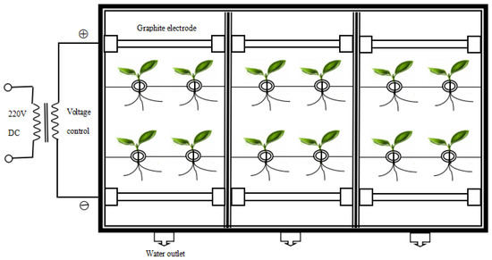 After 8 weeks of cultivation, L. japonica were transferred into adumbral containers (45 × 22 × 15 cm3) with 6 L Hoagland nutrient medium, 4 plants for each. The nutrient medium was renewed once every 3 days. Subsequently, Cd2+ (CdCl2 × 2.5 H2O, Kermel Chemical Reagent Co., Ltd., Tianjin, China, >99%) was added into the nutrient medium to get: 0, 5, 25 and 50 (mg L−1), respectively. Additionally, a homogeneous electric field with a pair of graphite electrodes (10.0 cm length, R = 3 mm) connected to a DC power supply (220 V, 50 Hz) was applied for 6 h per day, and the electrical setting of the experiment is shown in Figure 1. The voltage gradients of 0, 1, 2, and 3 (V cm−1) are shown in Table 1. The experiment was repeated 3 times, and the plants were harvested 1 week later for analysis.