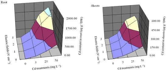 Above all, applying a medium-strength electric field enhanced the root and shoots growth of L. japonica. In the present study, under 2 V cm−1 voltage, the dry weight of root and shoots biomass was significantly enhanced to 5 mg L−1 Cd compared with the control. Our present results agree with previous reports proving that the electric field stimulated plant biomass production and growth by regulating the transport and distribution of plant growth hormones [27,28,33,42,46].