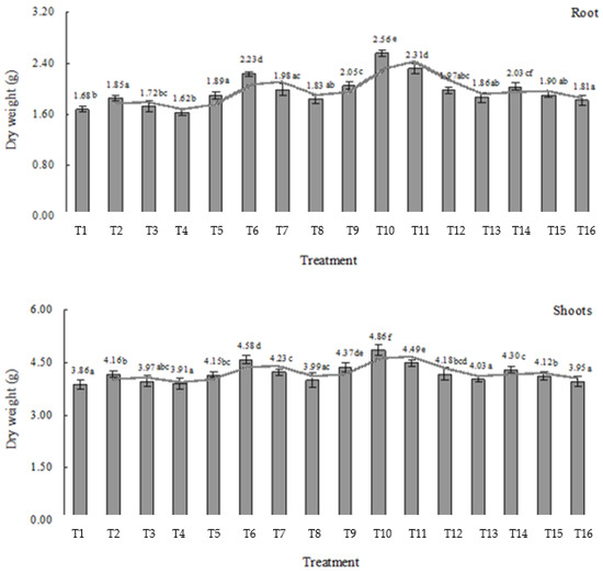 The root and shoots biomass of the plant are considered highly sensitive indicators in their response to heavy metal and other environmental stress [37,73,74,75]. The growth responses of L. japonica in terms of root and shoots biomass dry weight under different treatments are shown in Figure 3. Under T1–T4 treatments (under Cd stress without electric field), the dry weight of root biomass increased exposed to 5 and 25 mg L−1 Cd, and decreased slightly exposed to 50 mg L−1 Cd, indicating that the plants had a good tolerance to Cd stress. Under T5, T9, and T13 treatments (under electric field without Cd stress), the dry weight of root biomass significantly increased, especially under 2 V cm−1 voltage (T9), 22.02% higher than the control. Under T6–8, T10–12, and T14–16 treatments (under electric field and Cd stress), different voltages enhanced the dry weight of root biomass exposed to different concentrations of Cd compared to the control. Furthermore, under 2 V cm−1 voltage, the dry weight of root biomass exposed to 5 (T10) and 25 mg L−1 Cd (T11) were enhanced significantly by 52.38% and 37.50% higher than the control. A similar phenomenon [43] also shows that the application of a pulsed electric field increased the root dry weight of maize under drought stress, and the enhancement could result from the improved respiration metabolism under the influence of the pulsed electric field to affect the synthesis and substance transformation. When the plants were exposed to 50 mg L−1 Cd stress, different voltages promoted the dry weight of root biomass compared with T4 treatment (V0-Cd50).