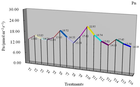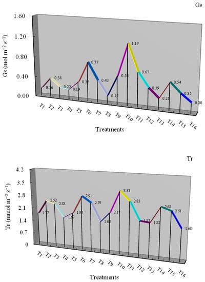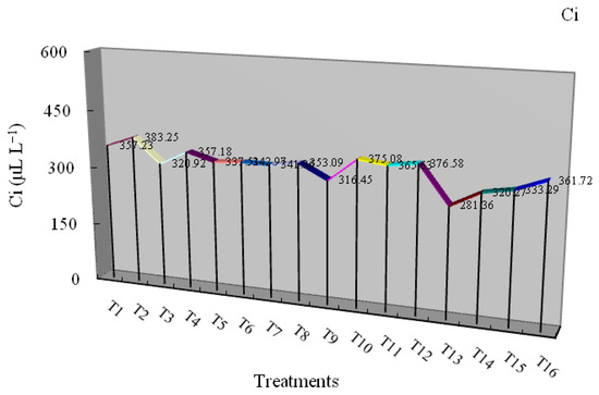 Photosynthesis, one of the most important biological processes for plant growth and food production, is especially sensitive to Cd stress [76,77,78,79]. As shown in Figure 4, the net photosynthetic rate (Pn), stomatal conductance (Gs), transpiration rate (Tr), and intercellular CO2 concentration (Ci) in the leaves of L. japonica under different treatments were evaluated. The significant stimulating effect of Pn exposed to low concentrations of Cd resulted in the improvement of gas exchange and transpiration in terms of the increase in Gs, Tr, and Ci, indicating the positive effect of low Cd concentrations on the contents of Rubisco [22]. A similar phenomenon was also found in maize plants [49]. The Pn, Gs, and Tr of the plants exposed to Cd stress concentrations had a similar response visualized as an inverted U-shaped curve under different voltages. Under different concentrations of Cd stress, the maximum Pn, Gs, and Tr of the plants reached 22.95 μmol m−2 s−1, 1.19 mol m−2 s−1, and 3.33 mmol m−2 s−1, and all were enhanced significantly by 2 V cm−1 voltage (T10, V2-Cd5). It is coincident with root and shoots biomass dry weight, indicating the combination of the low Cd supply (5 mg L−1) and medium voltage (2 V cm−1) was beneficial to elevate the photosynthetic capacity and growth of the plants. A similar phenomenon is also described as the hormesis effect [53]. When the plants were exposed to higher concentrations (25 mg L−1), different voltages significantly enhanced the Pn, Gs, Tr, and Ci of the plants. However, with the increase of Cd concentration in the medium, the effects were not obvious compared with T3 treatment (V0-Cd25; p < 0.05). Some studies reported that Cd negatively affected photosynthesis [80,81,82], which may be attributed to the inhibition of chlorophyll biosynthesis, pigment-protein complexes, thylakoids, or reduction in growth [80,83,84]. However, in our present study, increased or unimpacted photosynthesis showed that L. japonica did not suffer metal toxicity and produced metabolites for absorption, defense, growth, and development, which may be related to good tolerance and hyperaccumulation characteristics of the plant to stress [85]. Under T13-T16 treatments, the increased Ci with the increase of Cd concentration in the medium may result from inhibiting chloroplast metabolism via hampering light and dark reactions of photosynthesis or Calvin cycle enzymes and the photosynthetic electron transport chain [86].