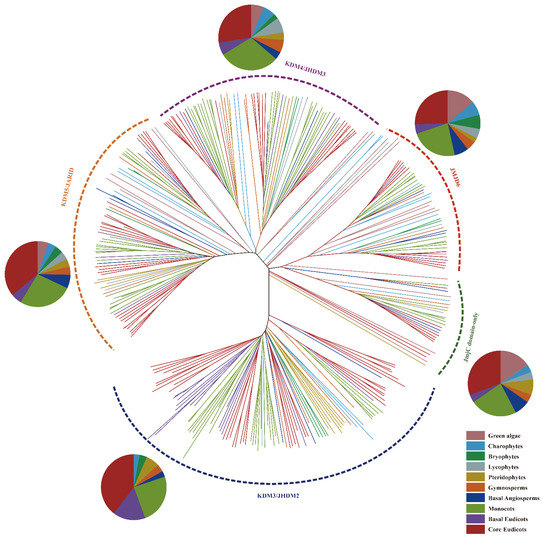 In order to further study the evolutionary relationship between JmjC proteins in green plants, a multiple sequence alignment was performed on the full-length amino acid sequences of 332 JmjCs, and the neighbor-joining (NJ) phylogenetic tree was constructed using MEGA 7.0 software. As shown in Figure 2, all JmjC genes formed five branches, namely, KDM4/JHDM3, KDM5/JARID, JmjC domain-only, JMJD6, and KDM3/JHDM2 (Table S2). From the pie chart analysis, it can be clearly seen that most of the JmjC genes in all subfamilies were present in eudicotyledonous and monocotyledonous plants (Figure S1). Moreover, there were differences in the number of JmjC genes among different subfamilies. For example, the KDM3/JHDM2 subfamily had the largest number of JmjC family members, a total of 104, but no members of green algae of lycophytes belonged to the subfamily. Additionally, the number of KDM3/JHDM2 subfamily members varied the most, ranged from 0 to 17 (A. coerulea). Additionally, the number of JmjC genes in the JmjC domain-only subfamily was the least, only 28 in total, and the majority contained four genes in A. thaliana. In chara (M. endlicherianum) and bryophytes (P. patens), no members of the JmjC domain-only subfamily were found, and there were three genes in green algae (O. lucimarinus); two genes in V. carteri, A. filiculoides, N. colorata, and S. italica; and only one JmjC gene in the other plants. Except for the KDM3/JHDM2 and JmjC domain-only branches, the remaining branches contained the JmjC genes of all the lineages analyzed. There were a total of 75 JmjC genes in the KDM4/JHDM3 branch, and there were similar numbers of genes in eudicotyledons and monocots, 23 and 24 JmjC genes, respectively, but no genes from O. lucimarinus belonged to this family. There were a total of 77 JmjC genes in the KDM5/JARID branch; among them, no genes were found in C. braunii, and 27 and 20 genes were found in eudicotyledons and monocots, respectively. There were 48 JmjC genes in the JMJD6 branch (Table S3).