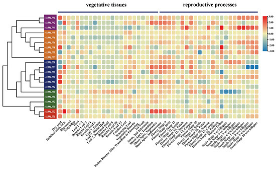 To investigate the role of plant JmjC genes in different stages of tissue development, RNA-seq data were used to study the expression profile of JmjC genes in model plant A. thaliana. The transcriptome data of A. thaliana revealed that JmjC genes had different expression patterns in different tissues (Figure 5), suggesting that these genes had different functions in various developmental stages. In 23 vegetative tissues, most AtJMJs had high expression in dry seed, cauline leaf, senescing leaf, and shoot apex. AtJMJ12, AtJMJ22, and AtJMJ27 were highly expressed in seed imbibed for 24 h. Moreover, most AtJMJs had higher expression levels in tissues during the reproductive processes than that in vegetative tissues. In particular, AtJMJ13 was highly expressed only during the reproductive stage. The expression levels of AtJMJs in the shoot apex; inflorescence; and in flowering stages 9, 10/11, and 12 were relatively high. Some genes were expressed significantly only at certain stages, for example, AtJMJ14 was highly expressed only in the seed stages, and AtJMJ15 only in the mature pollen and seed stages. Additionally, there were individual genes, such as AtJMJ16, that had low expression levels in all the tissues selected. The same subfamily may have different gene expression patterns: AtJMJ22 was highly expressed in various tissues, while AtJMJ21 only in dry seed.