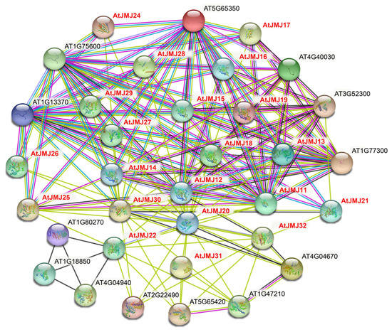 Functional network assembly of the A. thaliana JmjC proteins. Red letters are the A. thaliana protein. Light blue and purple lines represent known interactions determined by the database and experiments, respectively. Green, red, and blue lines represent predicted interactions from gene proximity, fusion, and symbiosis, respectively. Light green, black, and gray lines indicate other interactions from text mining, co-expression, and protein homology, respectively. Empty nodes: proteins of unknown three-dimensional structure. Filled nodes: some three-dimensional structures are known or predicted.