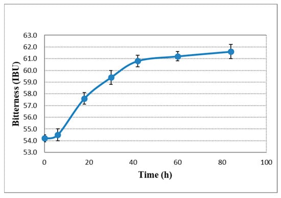 The bitterness value of beer increased significantly (p < 0.05) with almost 18% during the dry hopping. This may be due to the fact that the hop vegetal material can adsorb isomerized alpha-acids, allowing their oxidized form (water-soluble humulinones) to make a significant contribution to bitterness. Humulinones are insoluble at high temperatures, therefore their impact on beer bitterness in traditional hop additions is negligible []. According to Algazzali et al. [] it seems that humulinones are almost 66% as bitter as isoalpha-acids contributing significantly to the beer bitterness profile. Ferreira et al. [] concluded that after dry hopping, humulinones were responsible for up to 28% of beer bitterness, being a good marker for the quality of beer. Their effect is less significant for the beer obtained through the traditional hoping process due to the fact that these components are highly degraded during boiling and fermentation when they are absorbed into yeast. Furthermore, it has also been reported that in dry hopping polyphenol extraction from hop content and oxidation products of lupulones (hulupones) can also contribute to the bitterness and astringency of beer [,,]. Even if some polyphenols and humulinones have been reported as imparting bitterness, it seems that their contribution has been perceived as different. Parkin and Shellhammer [] report that the perceived bitterness was highly correlated with humulinone and less correlated with polyphenols content.