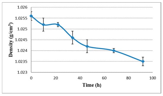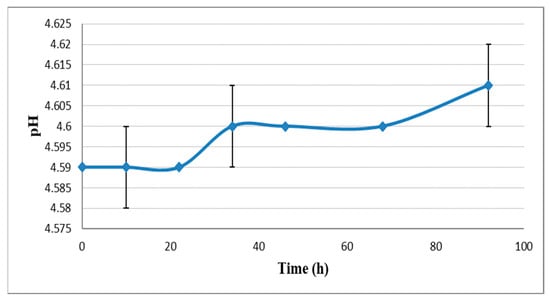 Change in the bitterness and density values can be seen in Figure 1 and Figure 2. From the start of the dry hopping procedure, a slow but steady increase in bitterness took place, starting from 54.2 IBU to 64.3 IBU. A significant (p < 0.05) bitterness increase of 15.6% was obtained during dry hopping. This increase was much higher than that obtained by others. Cocuzza and Mitter [] report only a 6% increase in bitterness after dry hopping. The pH value increase was insignificant (p < 0.05) from 4.59 to 4.61 (0.43%), as shown in Figure 3. These data do not correlate with data collected by other researchers as they report a significant increase in pH value after dry hopping [,]. CO2 content was also measured, with 3.56 g/L in the young beer and 4.48 g/L in the bottled product.