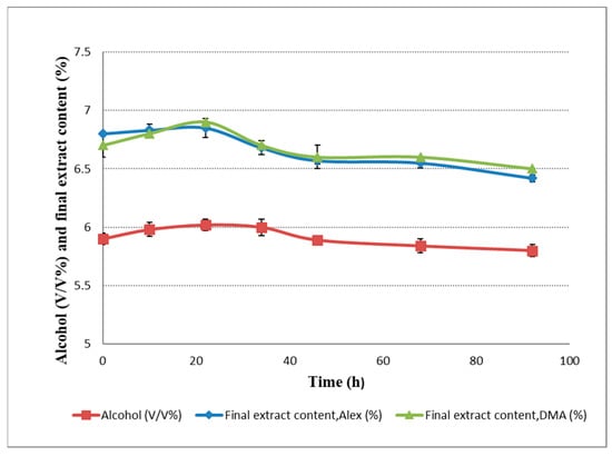 Mitter and Cocuzza also report that there is a small amount of alcohol concentration increase during the dry hopping procedure (7%) []. We also measured an insignificant increase (p < 0.05) in alcohol concentration (Figure 4) during dry hopping at 22 h mark, reaching a maximum concentration of 6.12 v/v%, followed by a decrease to 5.8 v/v% at 92 h. In the course of the dry hopping process the trend for density correlates with the alcohol content changes in the beer. We have measured a drop in density from 1.0255 g/cm3 to 1.0235 g/cm3 (Figure 2), similar data being also reported by Hauser et al. [].