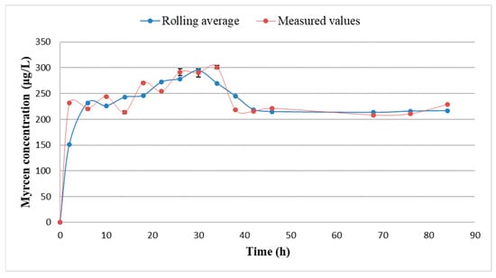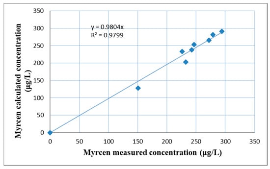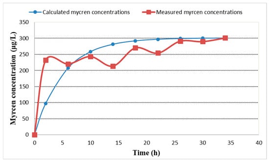 By curve fitting on the experimental results the model parameters were determined (Figure 7): maximum concentrations (cmax = 301 μg/L), dissolution rate constant (k = 0.1946 h−1), with correlation coefficient R2 = 0.873. For the dissolution rate the following model was adopted c = cmax(1 − e−kτ). The measured and calculated β-myrcene concentrations were plotted in Figure 8 (R2 = 0.9799). The differences were probably given by the inhomogeneity of the solution due to the size of the fermentation vessel.