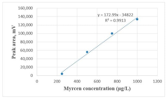 To obtain the standard solutions 4 × 100 mL of beer was measured and β-myrcene stock solution was added to them (93.3, 186.6, 279.9 and 373.2 μL) with an automatic pipette, with an additional 800 μL of IS. The solution was homogenized, 5 mL was measured out into the headspace glass vials and they were measured in the gas chromatography equipment. The obtained calibration curve of β-myrcene is shown in Figure 10 and the typical chromatogram in Figure 11.