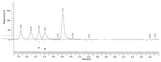Typical chromatogram for β-myrcene (2.27 min. butanol (B), 2.41 min. β-myrcene (M)).