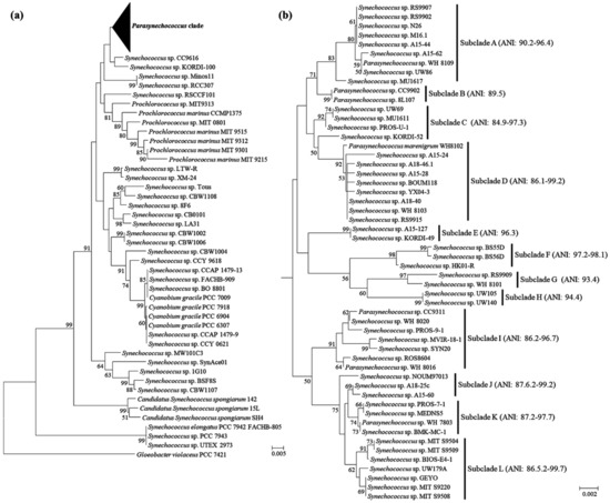 Figure 1. Phylogenetic tree (a) of 16S rRNA gene sequences. Parasynechococcus clade was shown in subtree (b). The ANI values among strains within subclades were shown in brackets. The scale bar indicated substitutions per site.