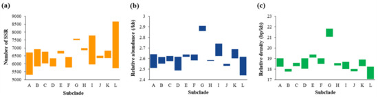 Figure 2. Number (a), relative abundance (b), and relative density (c) of SSRs in genomes of 54 Parasynechococcus-like strains. Data were presented by the subclades (A–L) identified in Figure 1b.