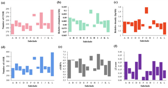 Figure 3. Number (a), relative abundance (b), and relative density (c) of CSSRs in genomes of 54 Parasynechococcus-like strains; (d) number of cSSR in each genome; (e) cSSR% = ncSSR/nSSR, percentage of individual SSRs being part of CSSRs; (f) |Z|, statistical significance of CSSR representation. Data were presented by the subclades (A–L) identified in Figure 1b.