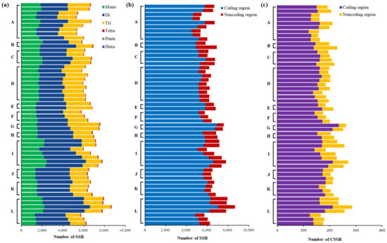 Figure 4. The SSR and CSSR distribution patterns of 54 Parasynechococcus-like strains genomes: (a) distribution according to SSR repeat type; (b) SSR distribution according to coding and non-coding regions; and (c) CSSR distribution according to coding and non-coding regions. Data were presented by the subclades (A–L) identified in Figure 1b.