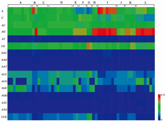 Figure 5. Relative abundance of standard motifs in mononucleotide, dinucleotide, and trinucleotide repeat type identified in genomes of 54 Parasynechococcus-like strains. The relative abundance of each motif was represented by a color block, whose color was proportional to the values (/kb) as indicated by the scale bar. Each vertical bar represented the motifs from one genome, and genomes were grouped by the subclades (A–L) identified in Figure 1b. Heatmap was generated using the gplots package in R v3.6.2.