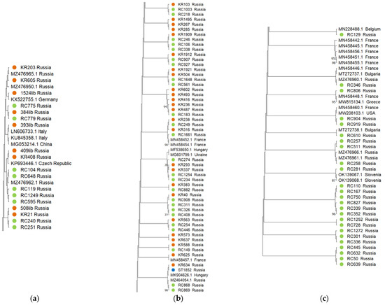 - Kumar, S.; Stecher, G.; Li, M.; Knyaz, C.; Tamura, K. MEGA X: Molecular Evolutionary Genetics Analysis across Computing Platforms. Mol. Biol. Evol. 2018, 35, 1547–1549. [Google Scholar] [CrossRef] [PubMed]