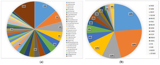 In total, there were 603 detailed reports of medicinal plant use, which refer to 219 taxa belonging to 69 families and one unidentified local taxon (Table 1). The dominant families were Asteraceae (14%), Solonaceae (7%), Rosaceae (6%), and Apiaceae (5%) (Figure 1). The majority of Detailed Use Report (DUR) was attributed to the treatment of four disease categories: digestive (24%), skin (22%), respiratory (11%), and general (11%).