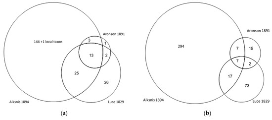 Two other taxa in Alksnis’s records needed special attention. Sedum vulgare is absent in the studied local floras [36,37,38] and has a single record in Estonia from 1864, the other records only come from Central Europe. Similarly, Aconitum lycoctonum has only a few records [37,39]. However, it is not similar enough to the local widespread taxon Aconitum napellus, which has blue flowers. Therefore, we identified the two taxa as Sedum sp. and Aconitum sp., respectively.