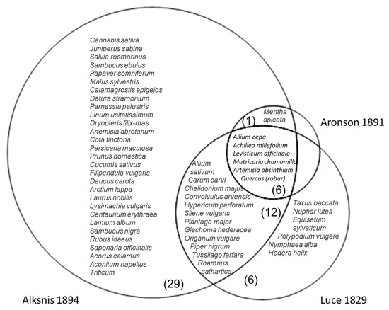 Alksnis’s article contained the greatest number of taxa, while he also had the highest number of taxa identified on the genus level (Figure 2, Table 2). Thirteen taxa were present in all three works: Achillea millefolium, Allium cepa, Arnica montana, Artemisia absinthium, Betula, Levisticum officinale, Matricaria chamomilla, Nicotiana rustica, Strychnos nux-vomica, Taraxacum officinale, Valeriana officinalis, Verbascum thapsus, and Quercus robur. Although Alksnis clearly used Aronson’s work (often referring to him), he did not include three taxa (Cinnamomum camphora shared with Luce and Prunus cerasus and Ferula assa-foetida mentioned solely by Aronson—of them only Prunus cerasus grows locally).