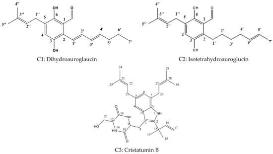 In order to investigate the active metabolites present in the identified fungus, the purification of crude FEA extracts was performed, and yielded three main compounds (Figure 1), namely, dihydroauroglaucin (C1), isotetrahydroauroglaucin (C2), and cristatumin B (C3). The isolated compounds were identified based on their physical characters and spectral data (1H-, 13C-NMR), and compared with the literature (Table 1 and Table 2).