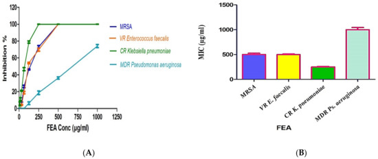 Inhibitory % and MIC values of FEA against different microbial resistance strains. (A) % of FEA extract inhibition against MDR bacteria. (B) MIC values of the FEA extract. All determinations were carried out in triplicate, and values are expressed as means ± SD.